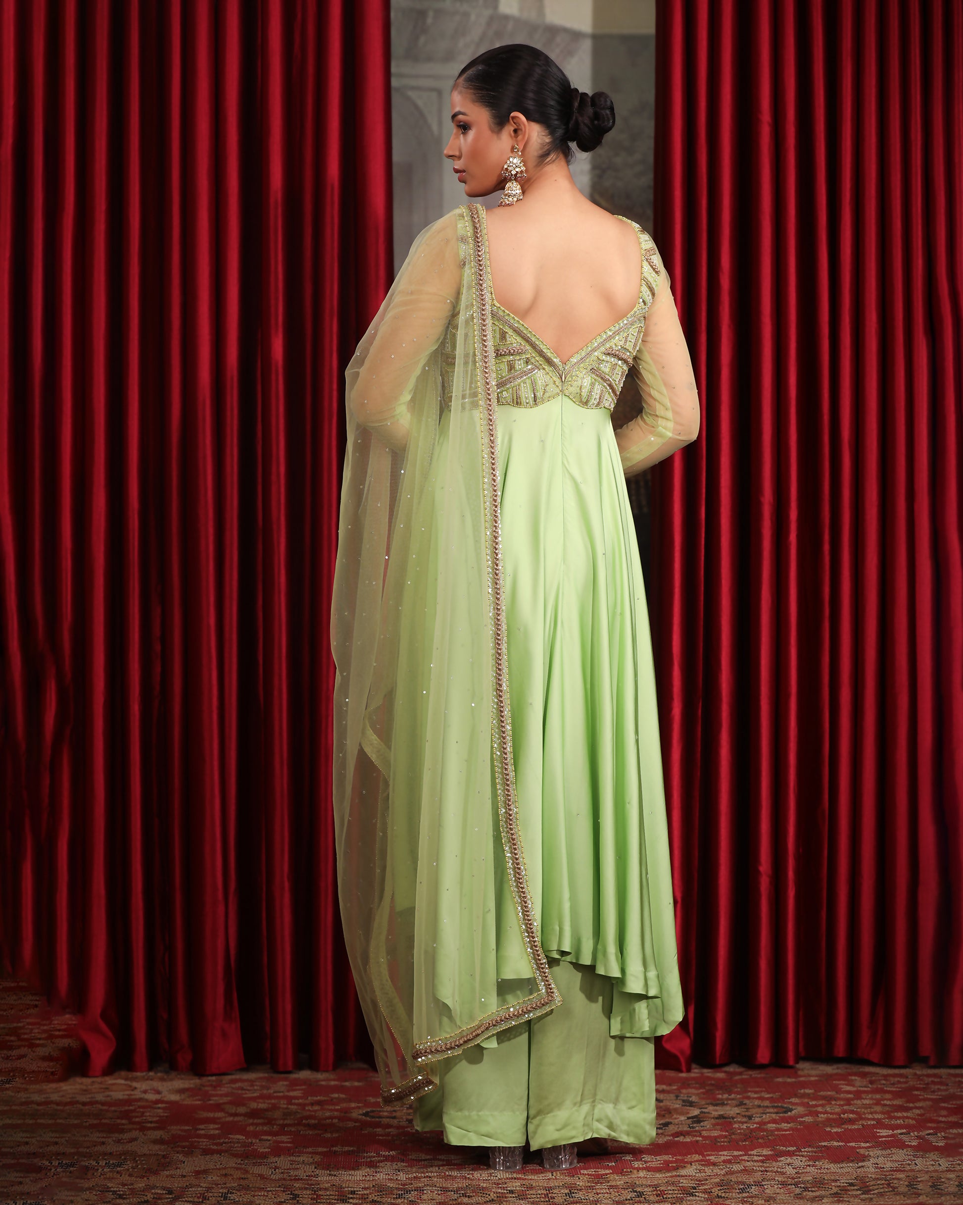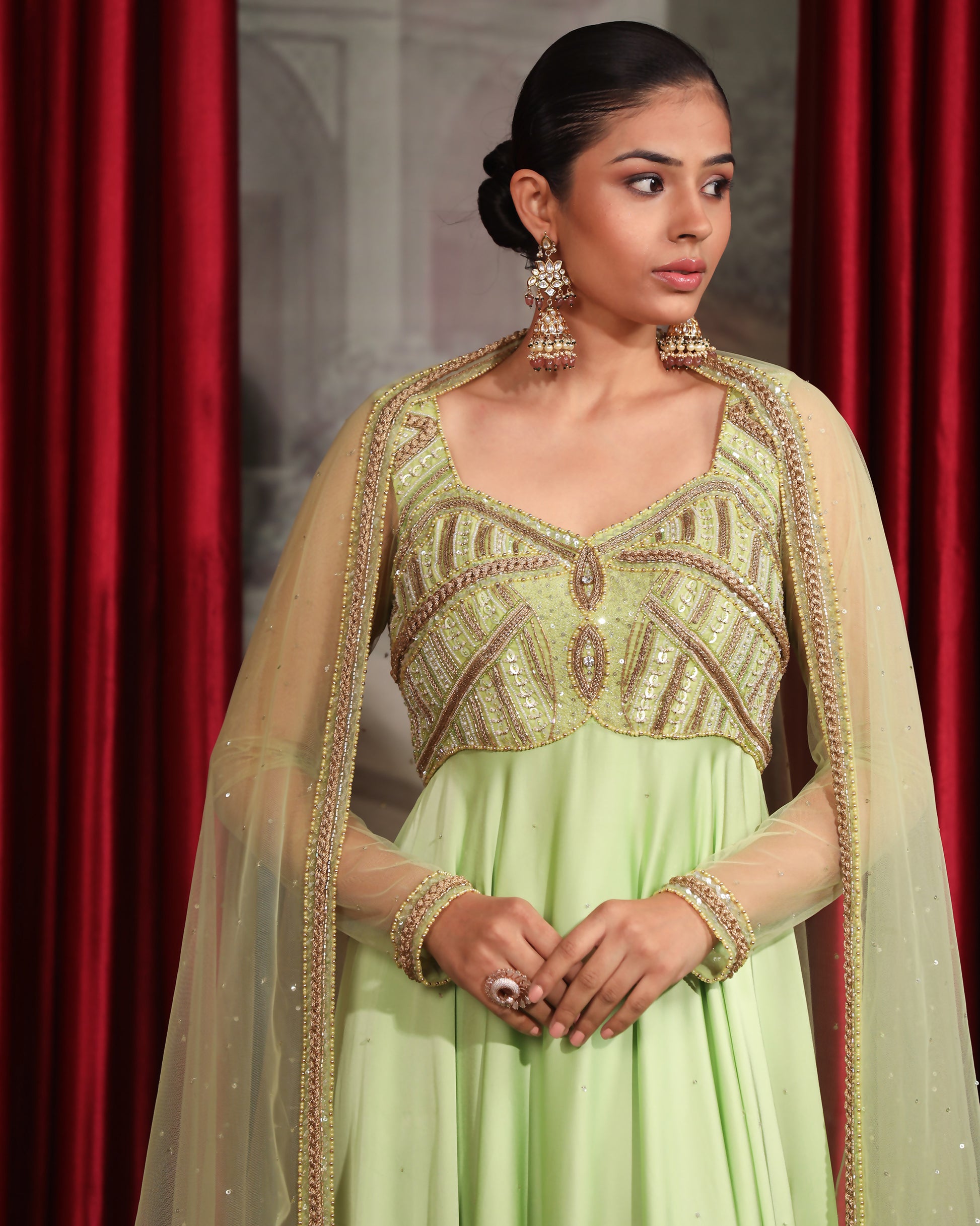 A stunning mint green kurta is adorned with beads, 3d sequins and lustrous cutdana. The unique addition of gold macrame design highlighted with beads, sequins gives the kurta a modern twist. The large ghera adds a graceful flow, while the sequins on the ghera create a dazzling effect. The kurta is paired wth straight pants and an embroidered cutwork dupatta, scattered with sequins.