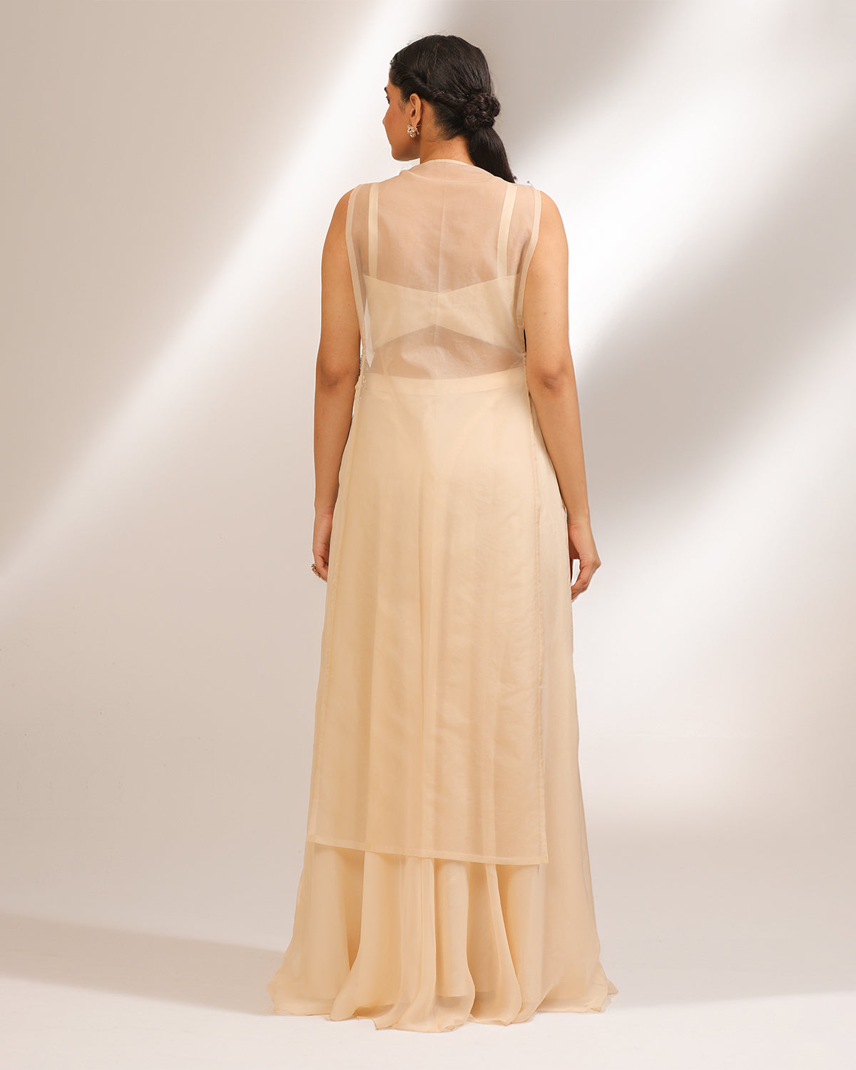 This organza skirt and crop top has been paired with an organza long jacket with Macramè detailing. All in a beige hue. 3 Piece Set.