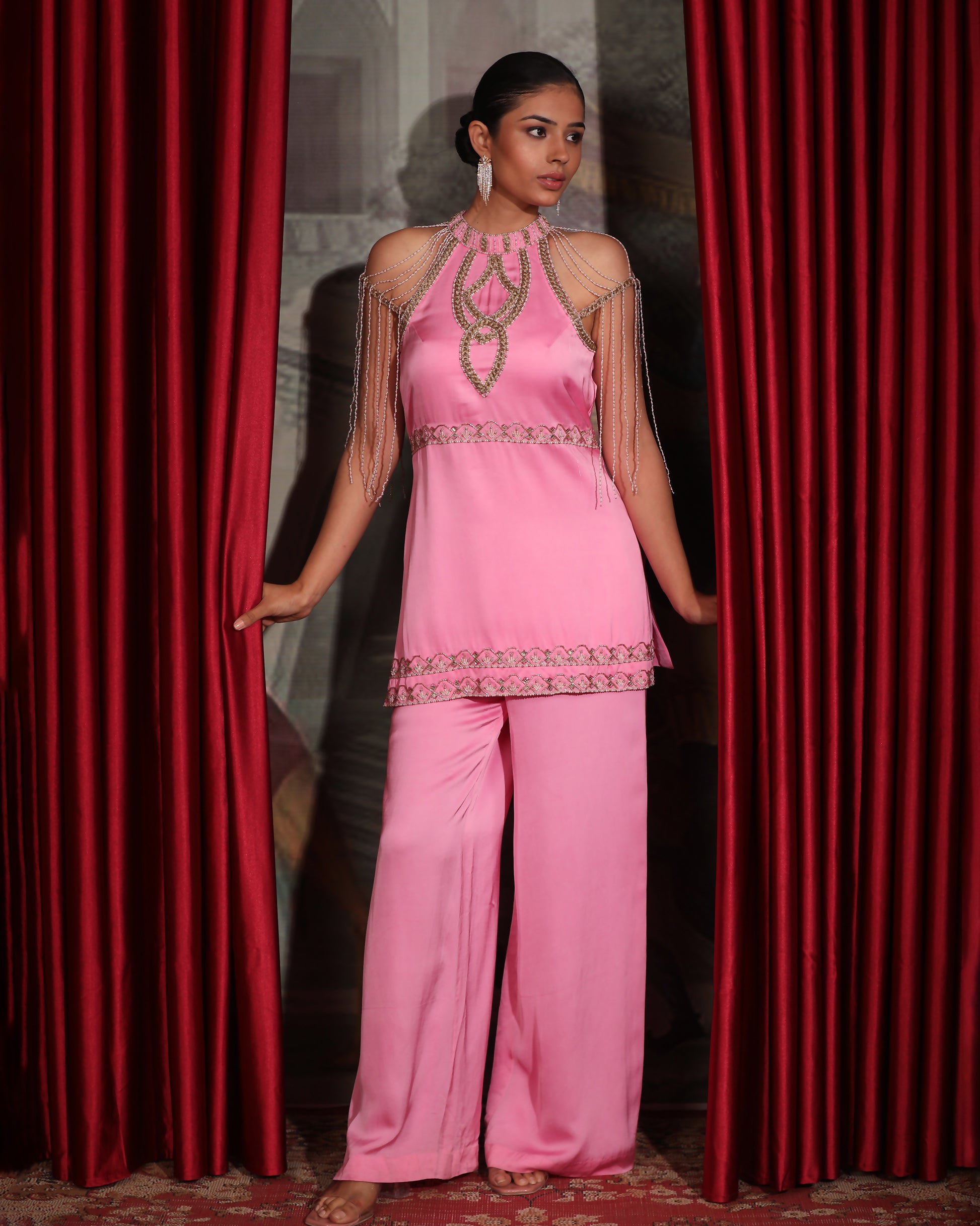 A pink halter neck top which is a masterpiece of craftsmanship, embroidered with the intricate detailings of pearls, beads cutdana and sequins. The top features a unique design with golden macrame on the shoulders, giving it a contemporary indian fusion look, with the hanging of beads and pearls simulating sleeves.Tthe kurta is paired with matching straight pants for a chic and modern ensemble.