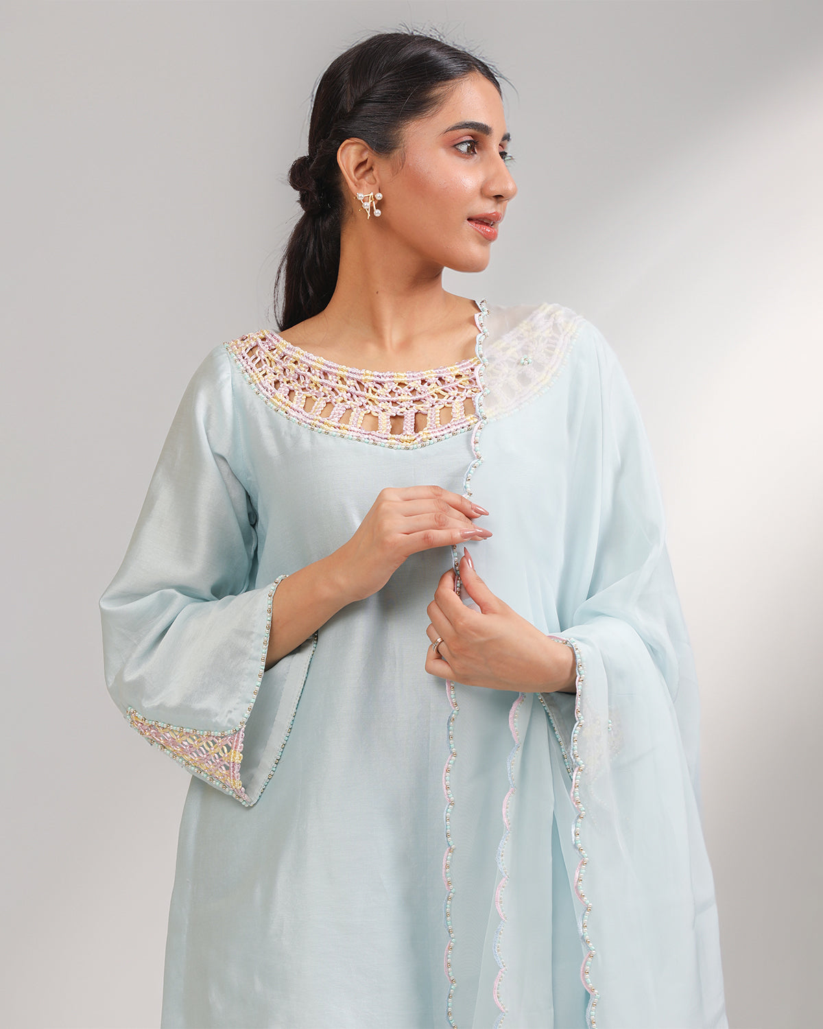 A Silk Chanderi Kurta Set with Macrame detailing inserts. Paired with a dupatta embroidered with beads. In a Pale Sky Blue Hue. 3 Piece Set.