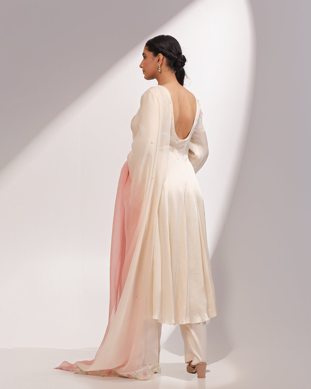 A silk embroidered anarakli in an off-white hue paired with an ombrè dupatta. The sleeves have a flared detailing. 3 Piece Set.