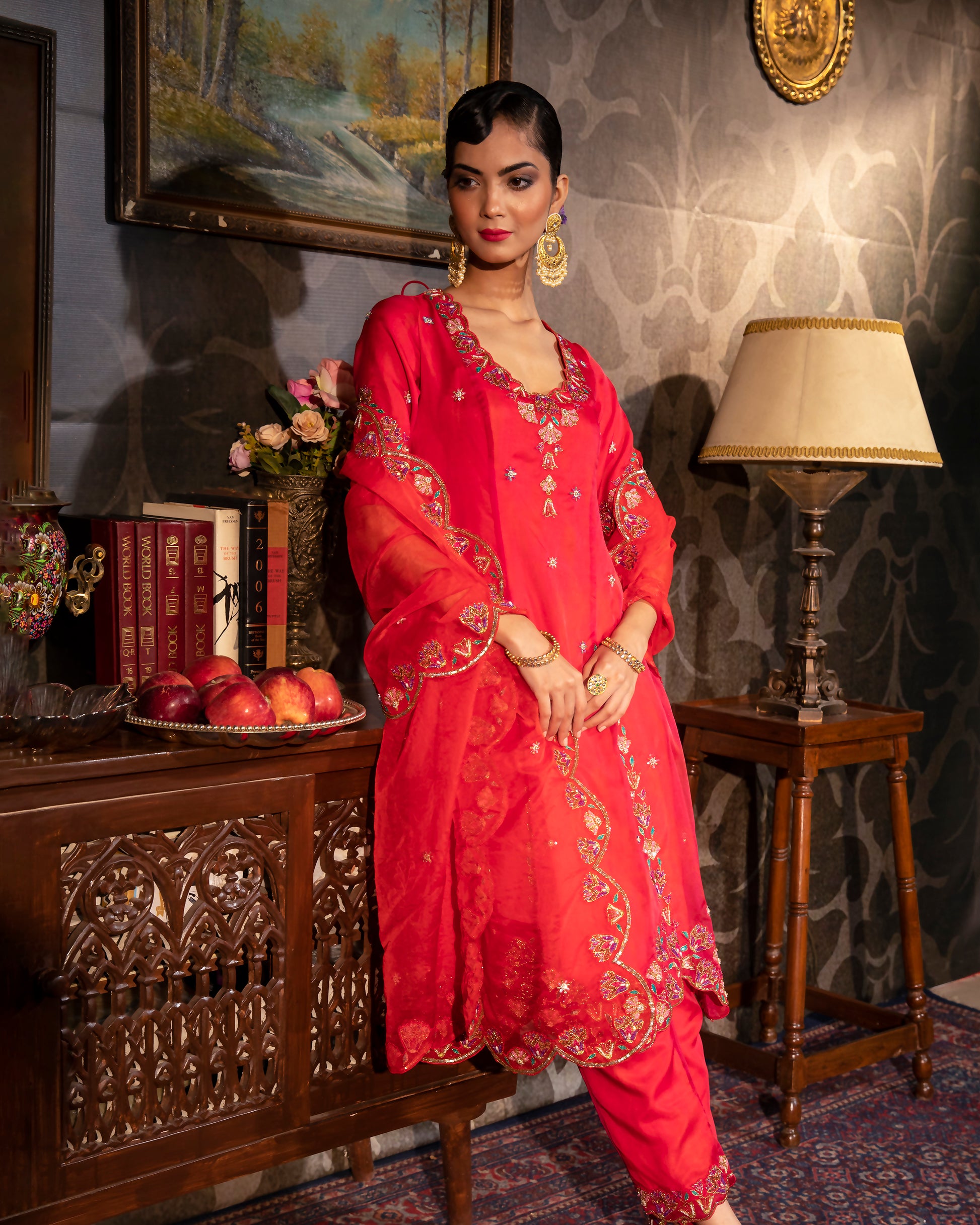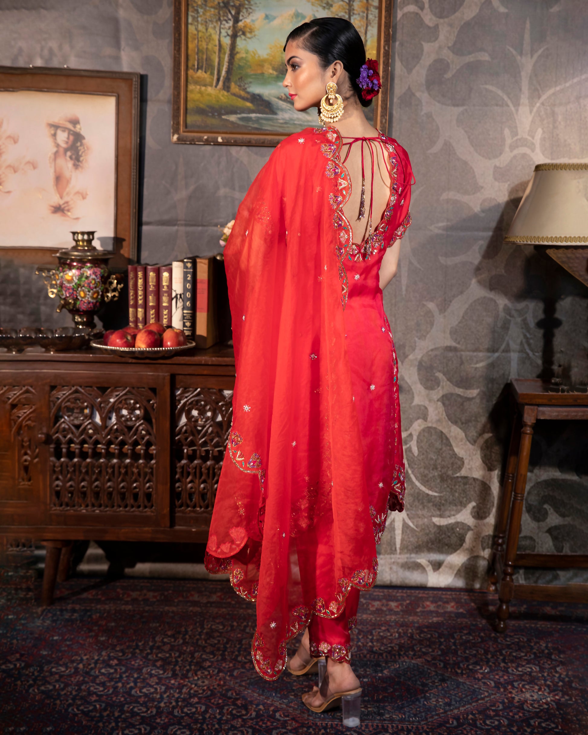 A red hued digitally printed organza kurta, embroidered with multi-shaded sequins and glass beads is teamed up with an embroidered cutwork pant and a scallop edge organza dupatta.