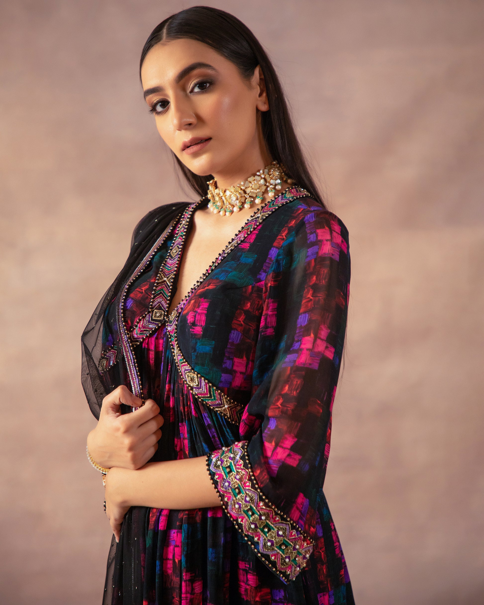 Featuring a black georgette digitally printed kurta with intricate hand embroidery adorned with beads, pearls and cutdana. The bell sleeves add a touch of grace, while the flared pants and net embroidered dupatta complete the ensemble with a perfect blend of style.