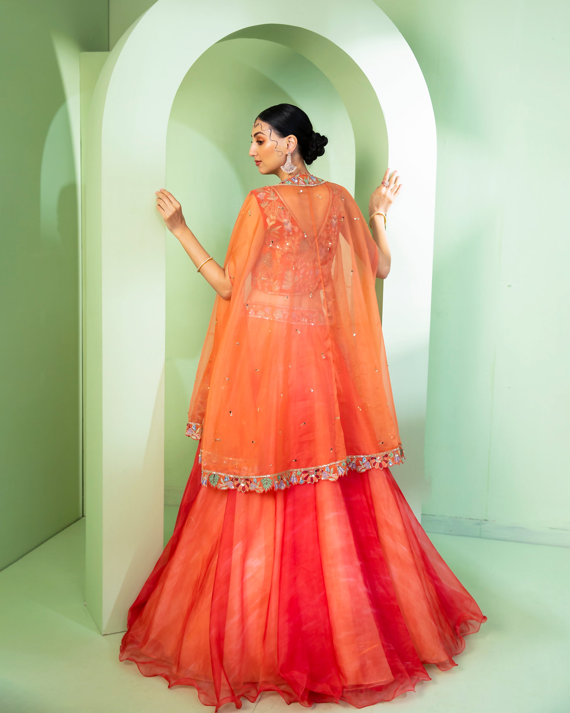 An Organza lehenga paired with a fully embroidered multi-hued blouse and a cutwork edged organza cape. All in a lovely coral shade!