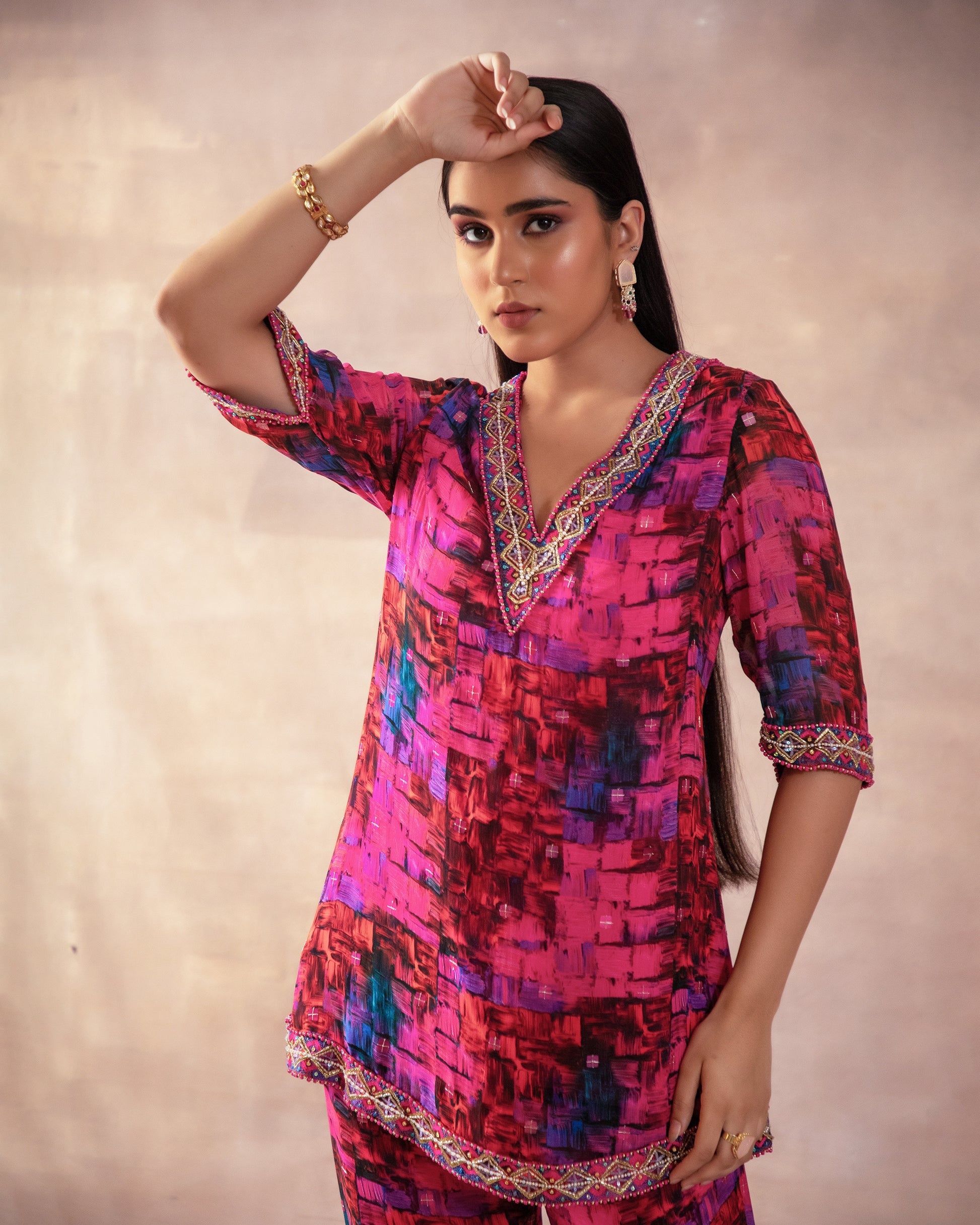 A digitally printed fuchsia pink georgette top featuring an intricate embroidered border inspired by art deco, is paired with straight pants, the ensemble is adorned with meticulous threadwork embroidery highlighted by the delicate touch of cutdana ,beads and pearls.
