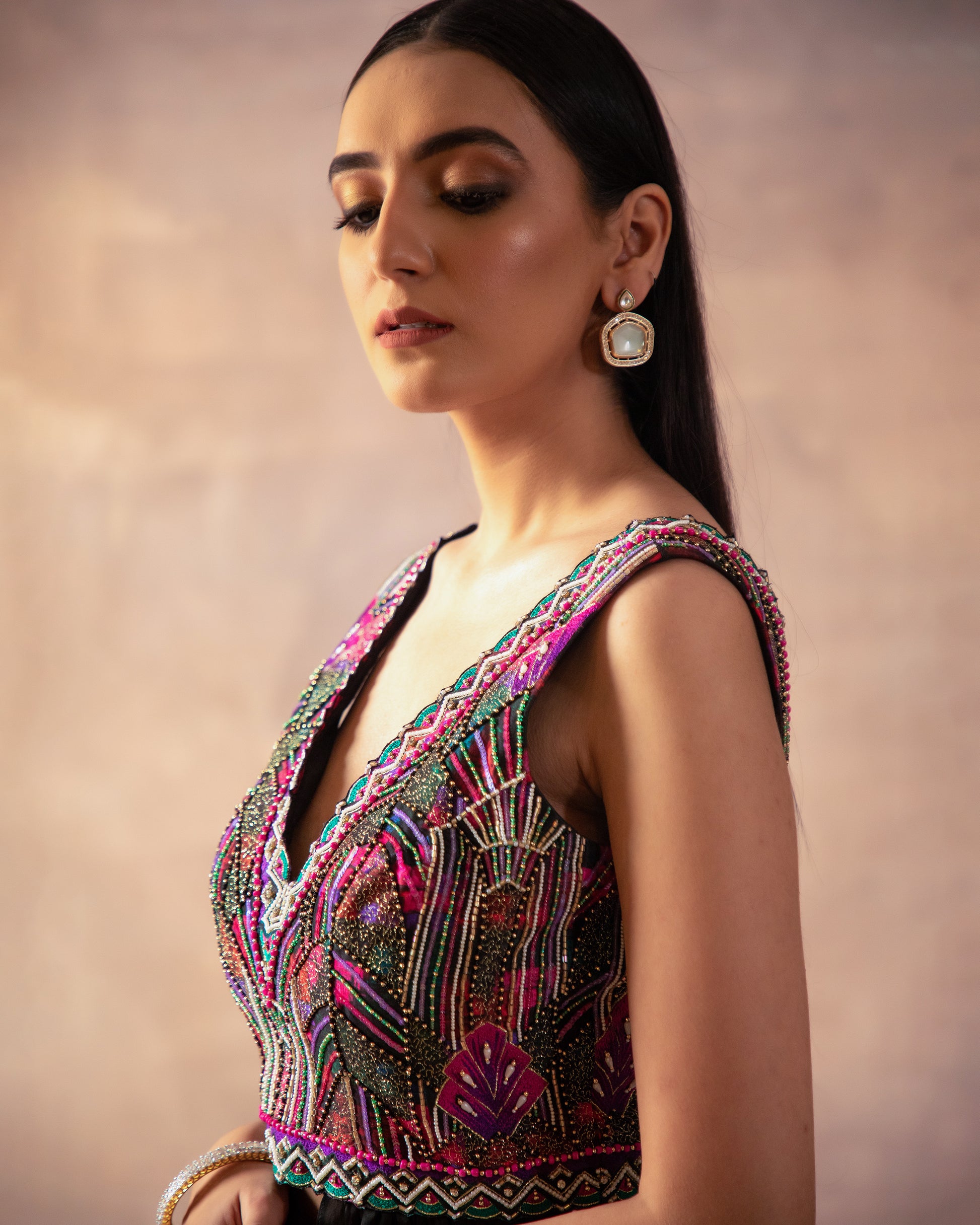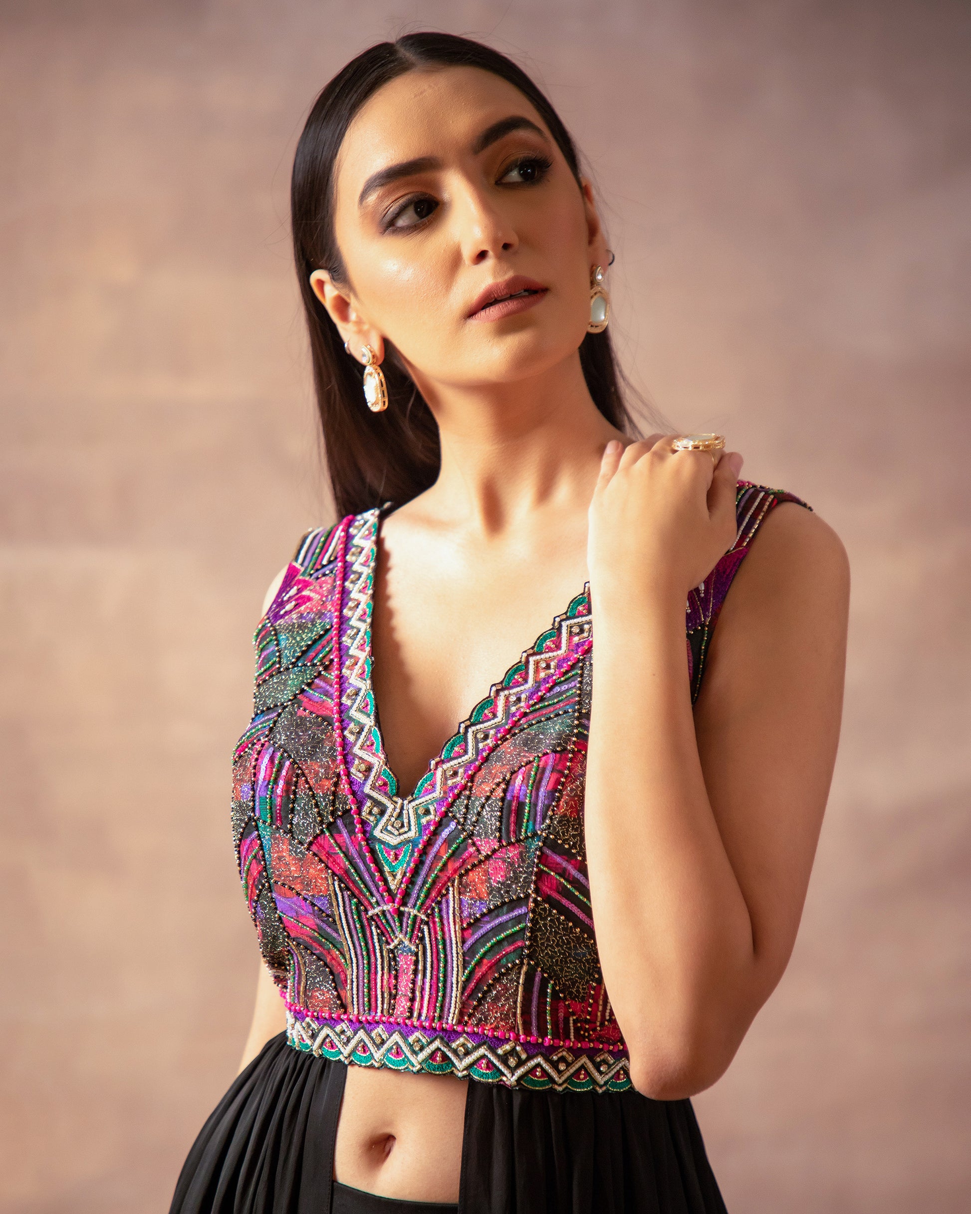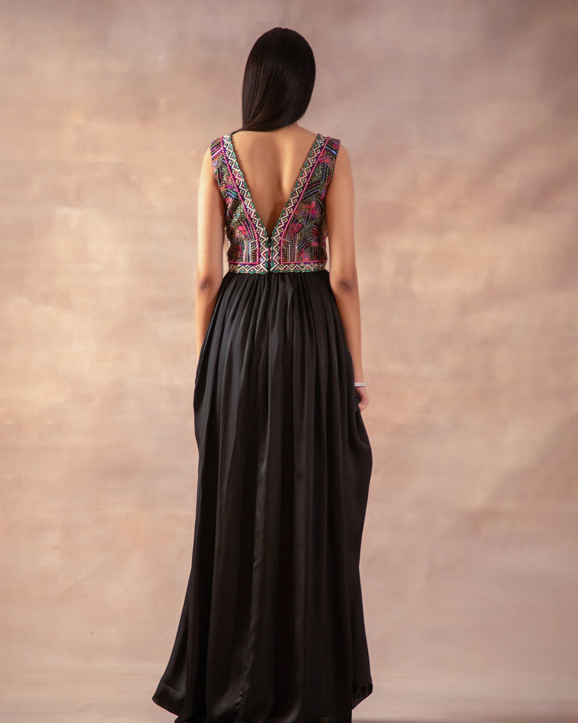 Introducing black silk dupion digitally printed top with cutwork neckline and hem that adds a touch of allure while the satin long flare with a front opening exudes elegance. The top is a masterpiece of craftsmanship, fully embroidered with the silk threadwork, and highlighted the intricate detailings with pearls, beads cutdana and sequins. Along with it comes a black satin straight fit pants complementing the top.