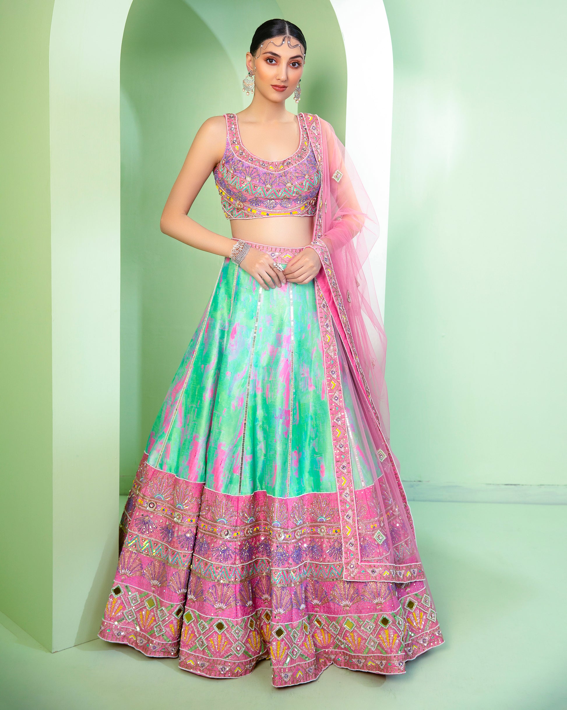 A bright green eye-catching lehenga for those fun, under the sun festivities! A silk dupion lehenga embroidered with pearls, beads and sequins, paired with a fully embroidered blouse and tulle dupatta.
