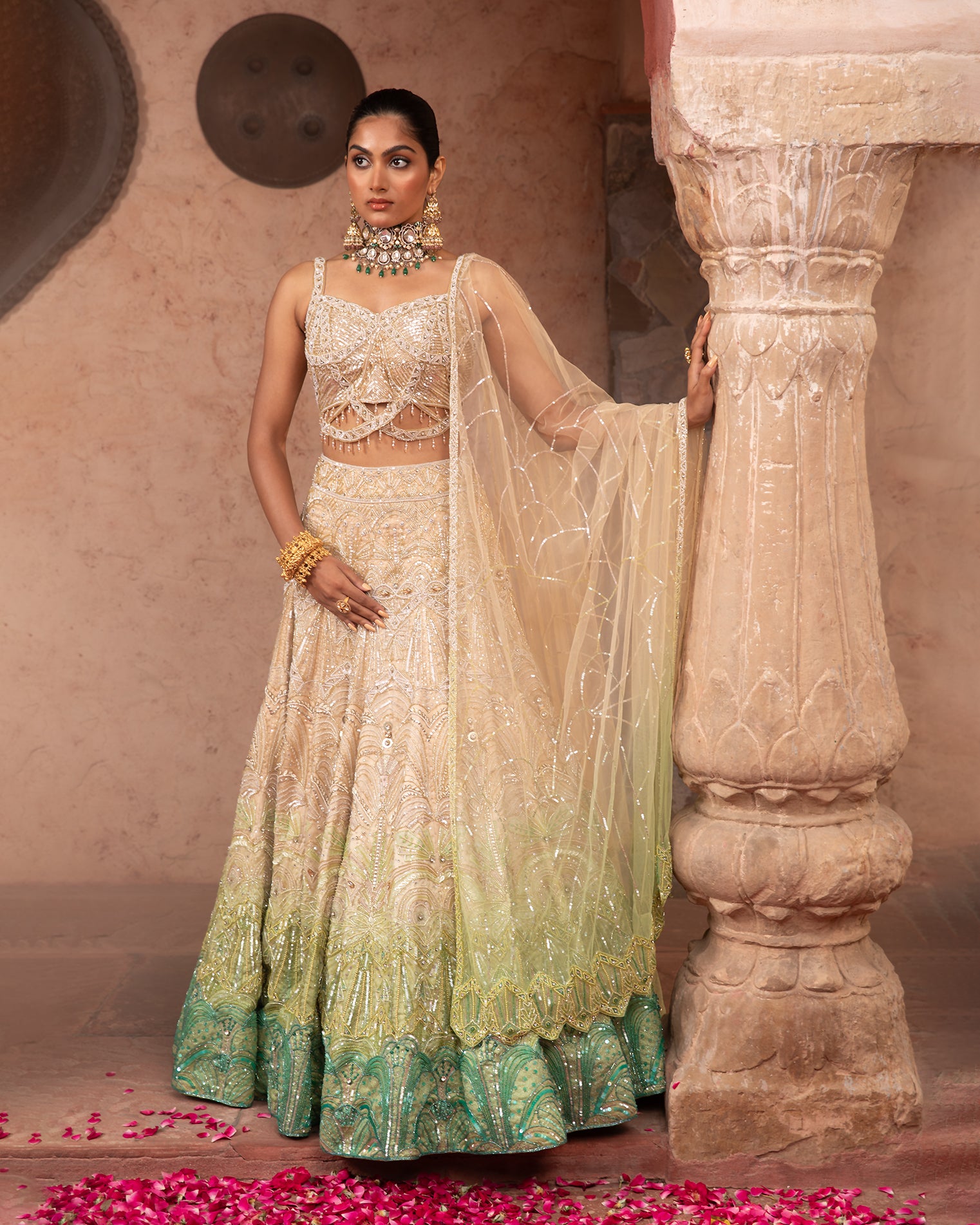 A breathtaking ombre lehenga transitioning from hues of gold to greens. Perfect for a bride seeking glamorous look, the lehenga is adorned with lustrous cutdana, shiny sequins, coloured pearls and shimmering stones echoing the ombre colour effect. A golden shiny embroidered blouse with embroidered straps over it adds a contemporary touch, complemented by hangings of crystal gold and pearls. The ensemble is completed by an ombre dupatta matching the lehenga hues, featuring cutwork embroidered borders inspired by an art deco design.