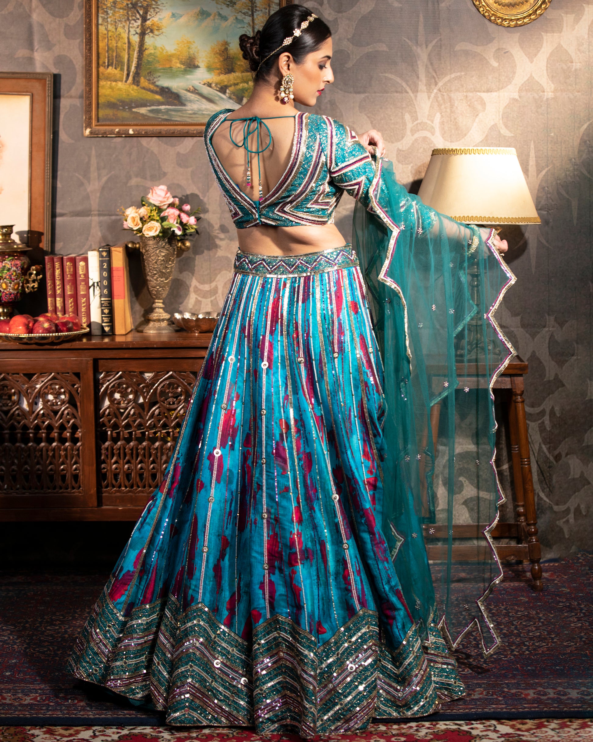 A digitally printed silk lehenga with chevron embroidered hem, paired with a silk cut work blouse embroidered in golden elements and a net cut work dupatta.
