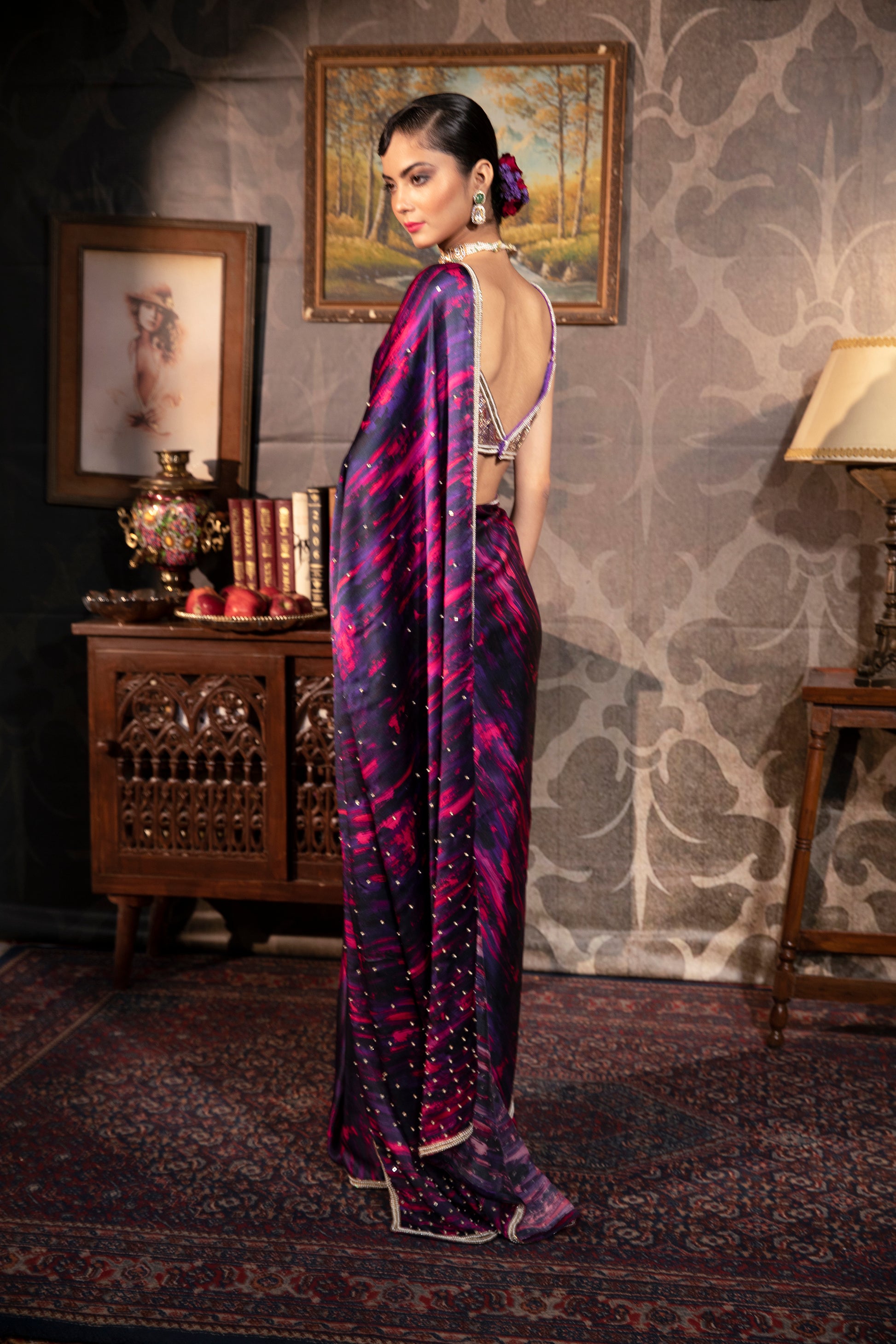 A digitally printed Silk Satin Saree paired with a fully embroidered blouse in golden elements and a petticoat.